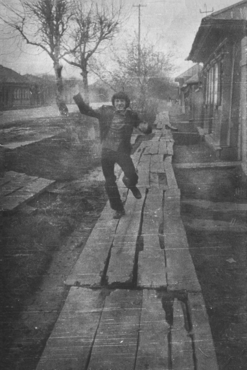С тех пор прошло больше полвека, а жители райцентра по-прежнему вынуждены балансировать на гнилых досках. XXI век, Омская область, Россия. Дощатый тротуар на улице Ленина, 1970-е гг. Из архива Тарагорода. |